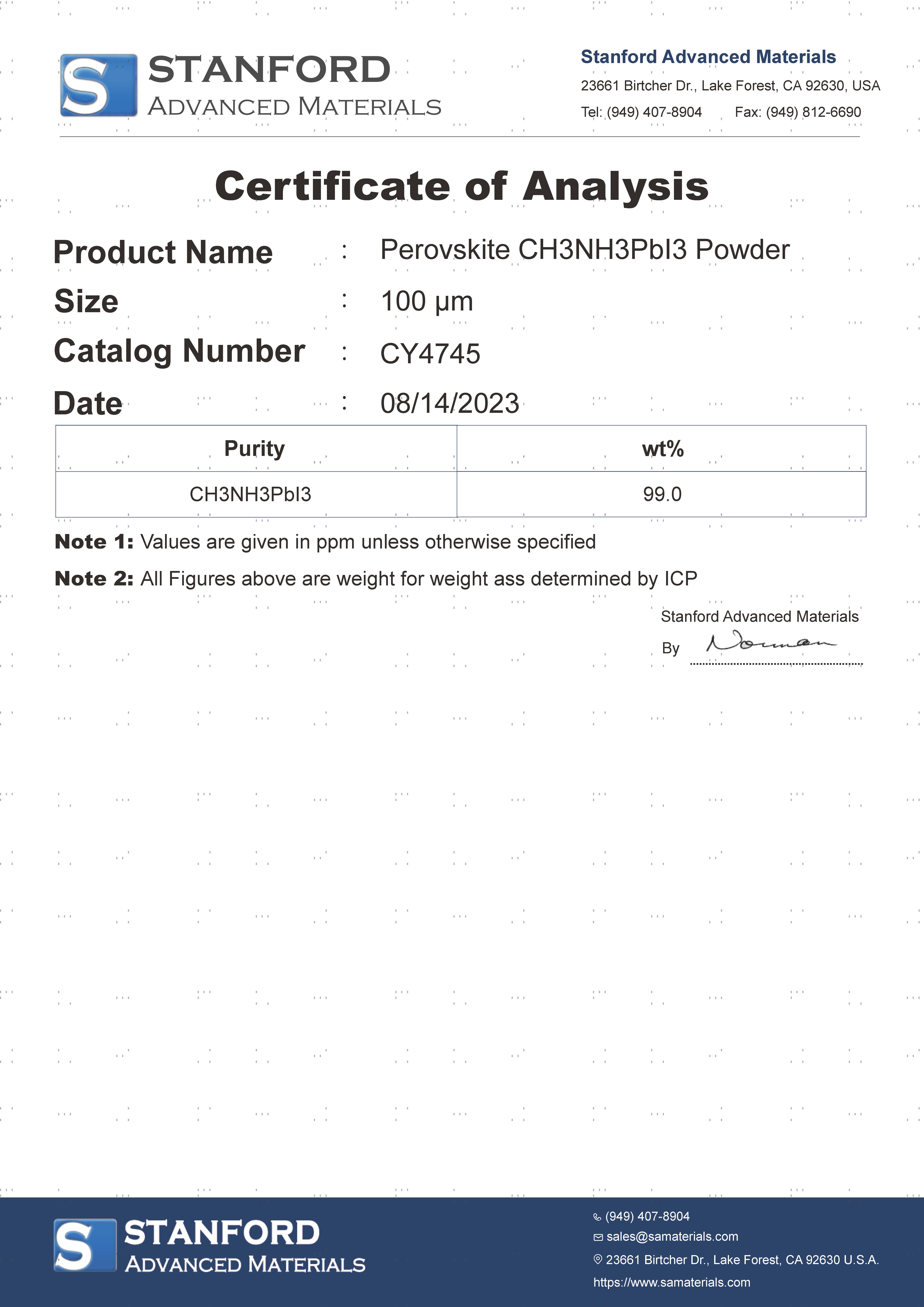 Perovskite CH3NH3PbI3 Powder Specifications